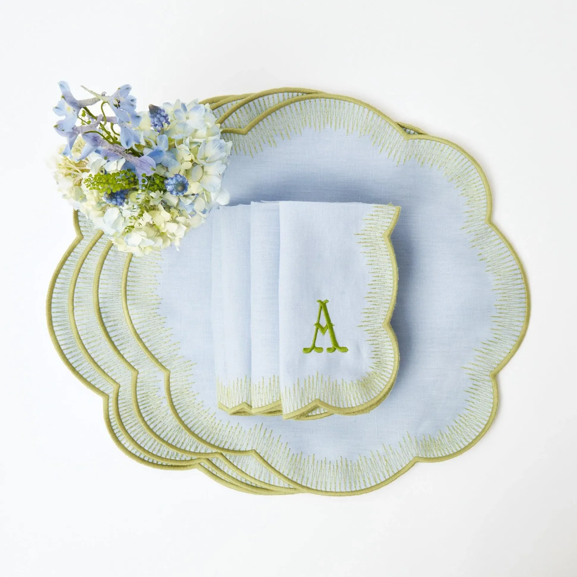 These Sky Blue Alathea Linen Placemats Have Elegant Scalloped Edges With A Flame Stitch Embroidered Detail In Avocado Green.They Look Beautiful Laid With Our Willow Tablecloth, Matching Alathea Blue & Green Linen Napkins & Ivory Cutlery Set.Set Includes:X 4 Alathea Sky Blue & Green Linen Placemats (40Cm X 40Cm)Materials: 100% Linencare Instructions: Machine Wash On A Cold Cycle Or Hand Wash And Leave To Air Dry.For Bespoke Quantity Of Placemats And Napkins Please Email [email protected].