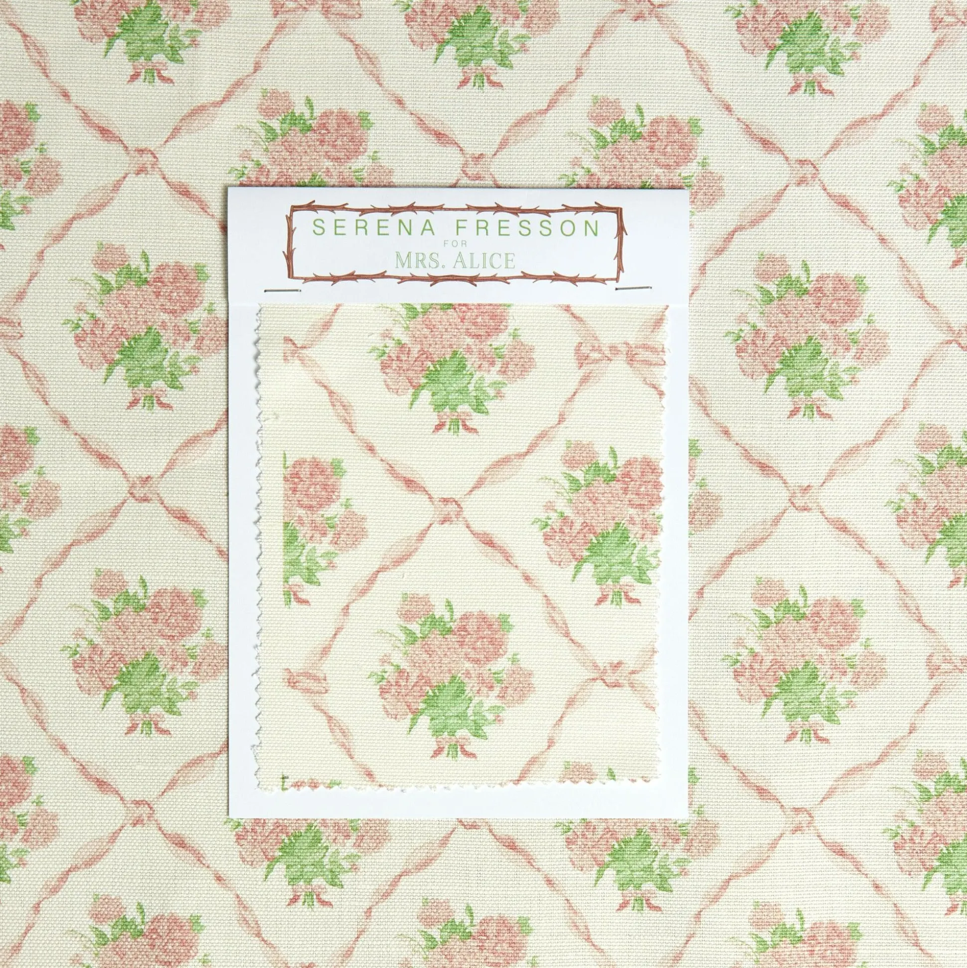 This Pretty And Feminine Fabric In Pink, Named After Founder Alice Naylor-Leyland Was Designed By Her Mother Serena Fresson. With A Trellis Of Ribbons, Bows And A Bouquet Of Flowers It Was As Serena Puts It – “All The Things That Alice Loves.” Working Perfectly As A Cushion, Or Upholstered On A Sofa Or Armchair It Will Also Look Charming As A Pair Of Curtains. Minimum Order Quantity: 1 Metre (1.09 Yards) We Are Unable To Offer Returns For Cut To Length Fabric. Alice’s Bouquetma102.3 – Pink Repeat: H: 23Cm (± 3%) V: 23Cm (± 3%) Width: 142Cm (± 3%) Suitability: General Domestic Care: Dry Clean Only Composition: 55% Linen 45% Cotton Designed & Printed In England Fr Treatment Required For Upholstery [email protected] Www.Mrsalice.Com Please Note There Is Currently A Lead Time Of 7 Working Days From The Date Of