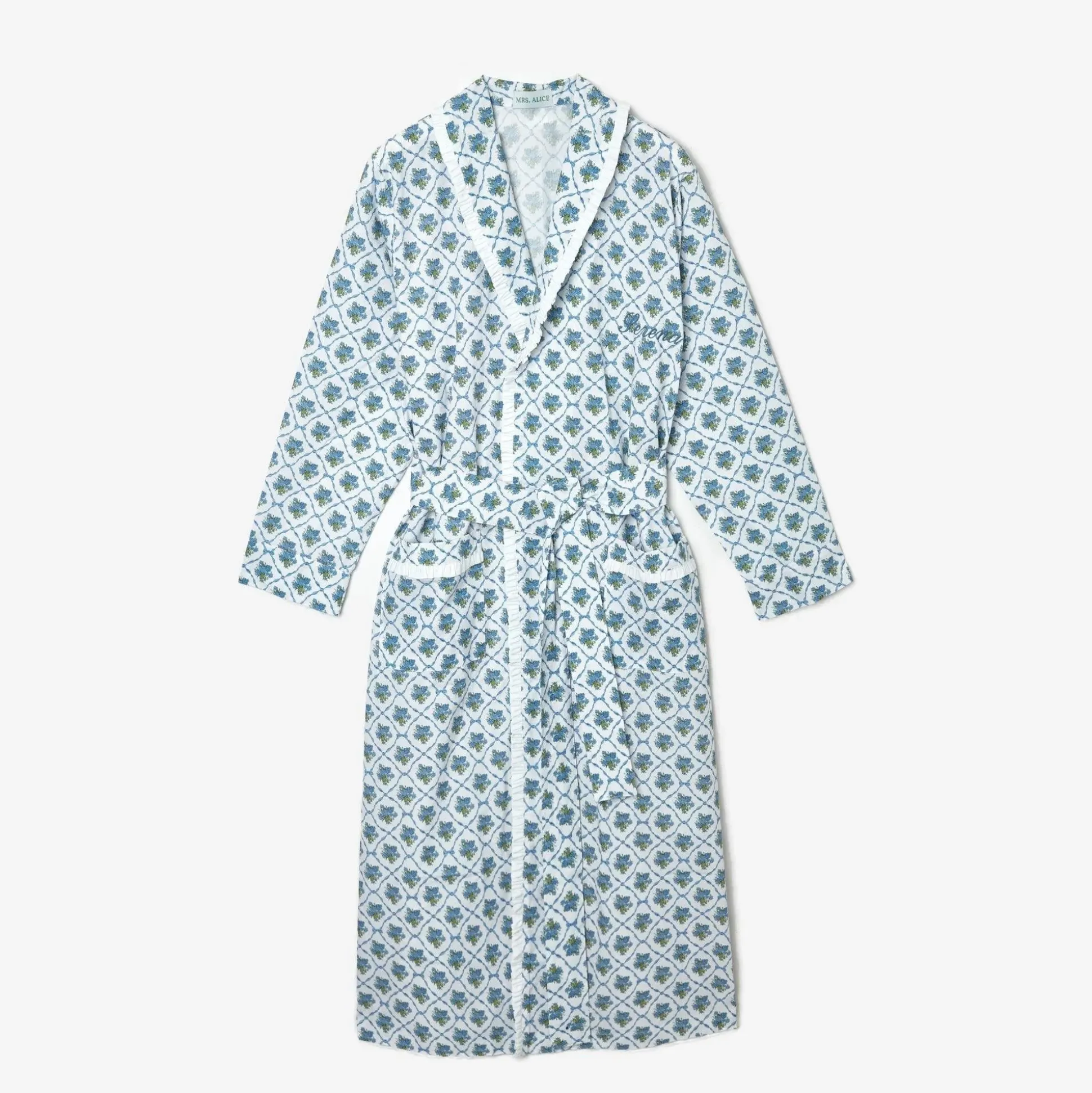 Designed In Our New Exclusive Alice’s Bouquet Print By Serena Fresson This Chic Blue And White Floral Dressing Gown Is Just Fabulous. With An Attractive Garland Design Set Between A Trellis Of Ribbons, Inspiration For This Piece Came From A Vintage Robe That Serena Has Owned For Decades. Tied With A Sash At The Waist, This New Gown, Designed For A Comfortable Fit Comes In A Children’s Size Too, So All The Family Can Coordinate – Aka Going Matchy Matchy. Settle Into Bed Alongside Our Matching Blue Bouquet Cushion Or Serve Breakfast In Your Robe With Our Blue Bouquet Linen & Blue Bouquet Tablecloth. Sizes: Small/Medium Or Medium/Large Info: 100% Cotton. Designed For A Comfortable Fit. Unlined. Care Instructions: 40º Wash Tumble Dry Low Temperature Do Not Bleach Iron Medium Temperature Dry Cleaning (Serena Fresson For Mrs. Alice Copyright ©) To Personalise Your Dressing Gown (As