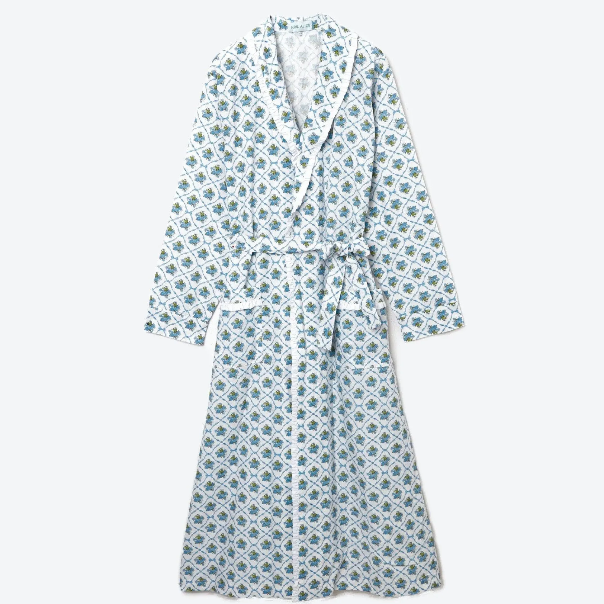 Designed In Our New Exclusive Alice’s Bouquet Print By Serena Fresson This Chic Blue And White Floral Dressing Gown Is Just Fabulous. With An Attractive Garland Design Set Between A Trellis Of Ribbons, Inspiration For This Piece Came From A Vintage Robe That Serena Has Owned For Decades. Tied With A Sash At The Waist, This New Gown, Designed For A Comfortable Fit Comes In A Children’s Size Too, So All The Family Can Coordinate – Aka Going Matchy Matchy. Settle Into Bed Alongside Our Matching Blue Bouquet Cushion Or Serve Breakfast In Your Robe With Our Blue Bouquet Linen & Blue Bouquet Tablecloth. Sizes: Small/Medium Or Medium/Large Info: 100% Cotton. Designed For A Comfortable Fit. Unlined. Care Instructions: 40º Wash Tumble Dry Low Temperature Do Not Bleach Iron Medium Temperature Dry Cleaning (Serena Fresson For Mrs. Alice Copyright ©) To Personalise Your Dressing Gown (As