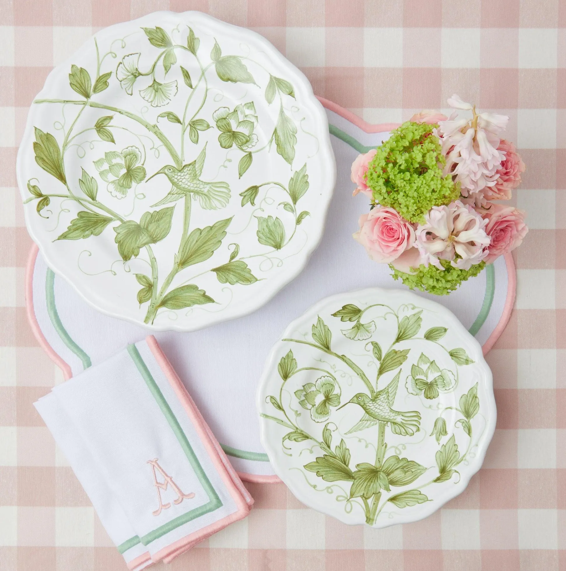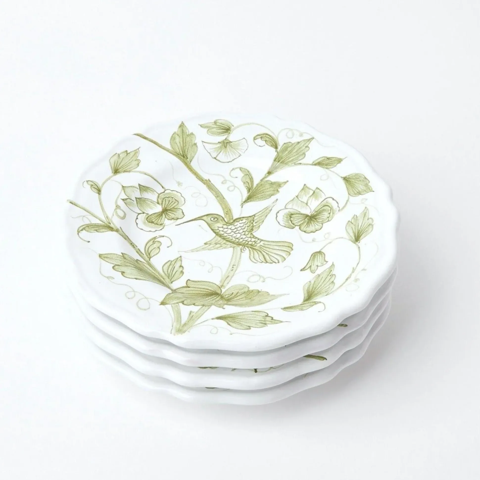 This Delightful Ceramic Plate With Its Unique Hand Painted Hummingbird And Foliage Design Was Coloured And Created Exclusively For Mrs. Alice.Hand Made In Southern Italy In A Soft Olive Green, It Has A Delicate Shaped Edge And Would Also Work Well As A Desert, Fruit Or Cheese Plate.It Will Accompany Its Matching Dinner Plate, Green Lacquer Placemats & Light Brown Rattan Effect Cutlery.Size: 21Cm
