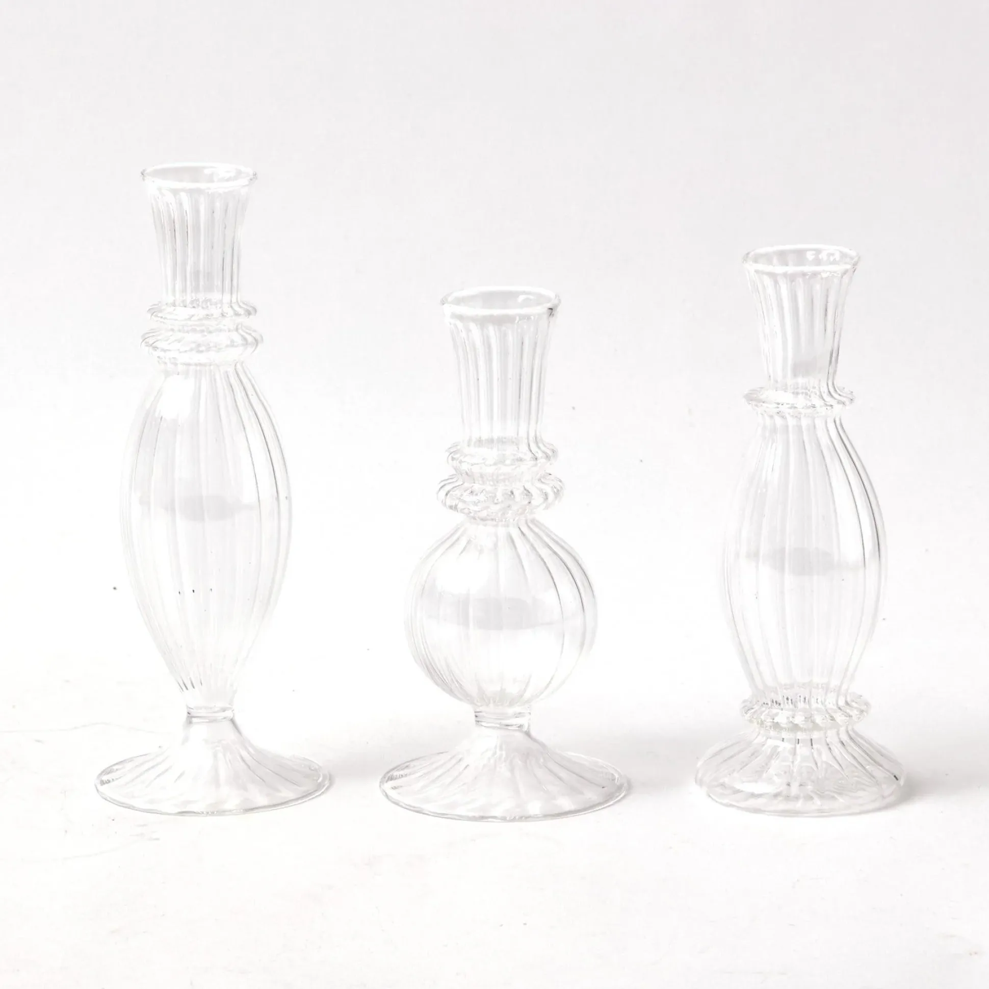 This Set Of 3 Lovely Bud Vases Are Made Of Mouth Blown Clear Glass.With Fluted Sides In Elegant Shapes This Set Will Bring The Joy Of Fresh Flowers To Your Home Or Table.Pair With Our Tall Mushroom Decorations, Chloe Toile Tablecloth & Scalloped Mushroom Plates.One Set Includes:X 1 Tall Shallot Vase (20Cm Height X 7.5Cm Diameter Base)X 1 Sphere Vase (16Cm Height X 7Cm Diameter Base)X 1 Small Shallot Vase (17Cm Height X 6.5Cm Diameter Base)