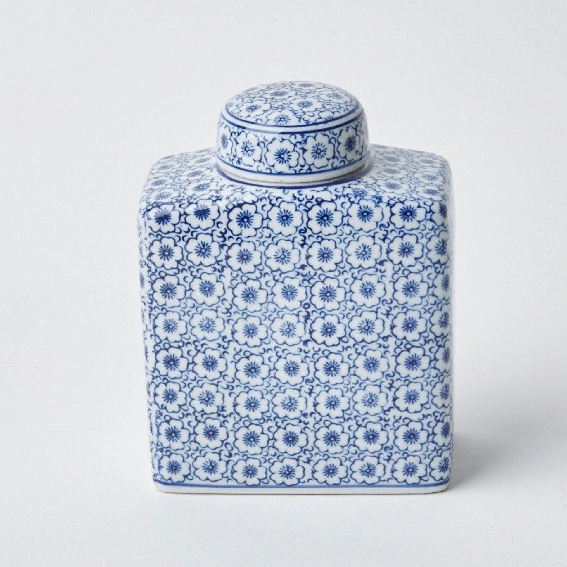 Our Classic Square Flower Print Ginger Jars Add A Sophisticated Touch To Your Table. Versatile And Elegant These Blue And White Lidded China Jars Can Be Used As A Vase Around The Home Or A Charming Table Centre Piece. Made Popular In The Country Houses Of 18Th Century England, These Jars Were Originally Used In Medieval China As A Storage For Spices Like Salt And Ginger.Pair With Our Serena Blue Applique Linen, Chinoiserie Pagoda And Blue Petal Bamboo Dinner Plates Size: 17Cm High X 12Cm Wide